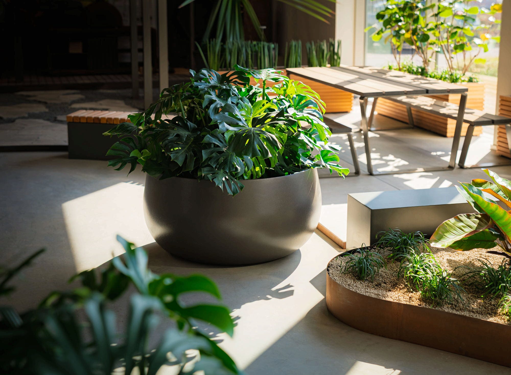 Der Kontrast aus sanft abgerundeter Form und scharfer Kante verleiht dem Pflanzgefäß Lora seine einzigartige Optik, mit der es einen besonders stilvollen Akzent in deinem Garten oder auf deiner Terrasse setzt. Es bringt moderne Ästhetik in deinen Außenbereich und unterstreicht zugleich eine ruhige Atmosphäre. So ist es die perfekte Ergänzung einer natürlichen Umgebung und fügt sich harmonisch in diese ein.