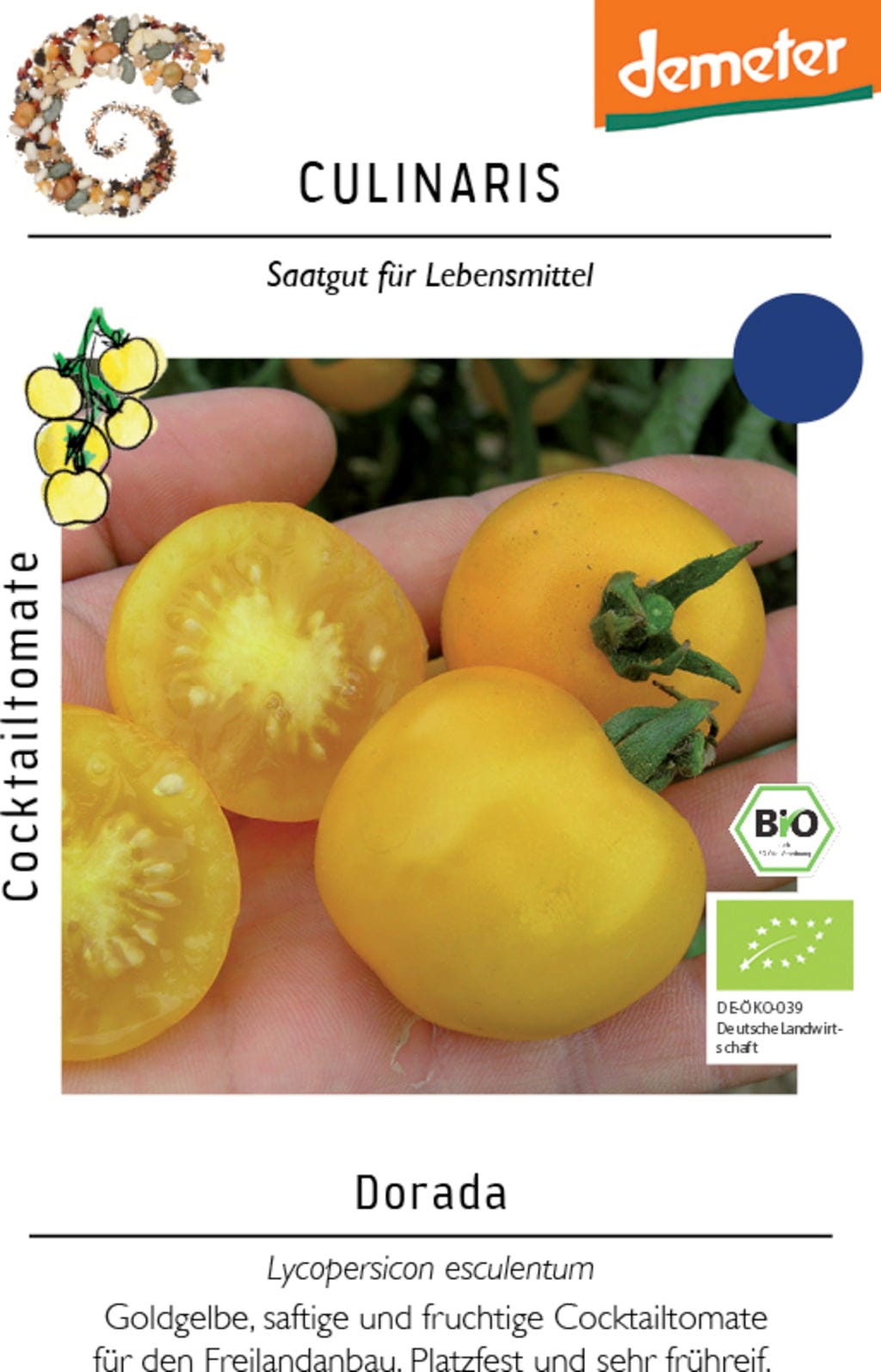 Dorada ist eine frühreife, goldgelbe Cocktailtomate mit saftigen und aromatischen Früchten. Sie wächst kompakt und eignet sich für Freiland, geschützten Anbau oder Kübel. Die Früchte können ab Anfang Juli geerntet werden.