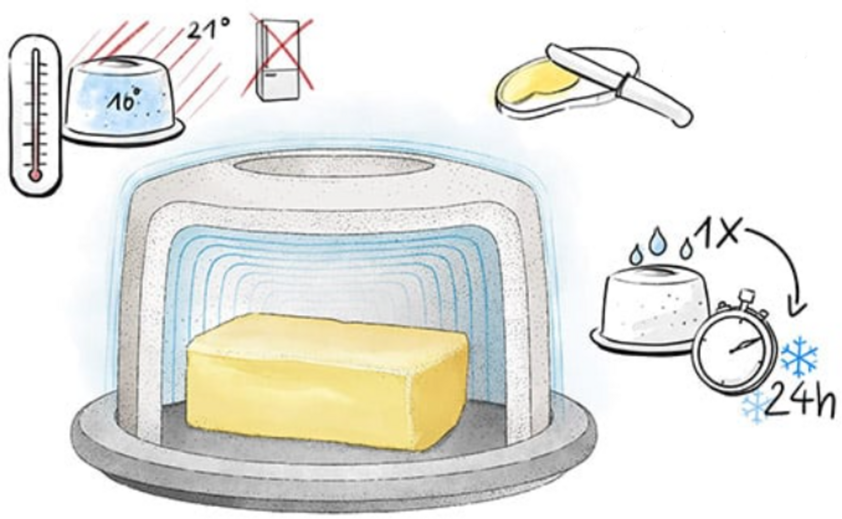 Der aus hochwertiger Keramik gefertigte, 2-teilige Butterkühler nutzt das Prinzip der Verdunstungskälte, um jederzeit streichfähige Butter zu haben - und das ganz ohne Kühlschrank.