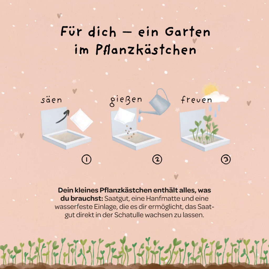 Sag es in fünf Buchstaben: „Hab dich ganz doll lieb“. Dieses liebevoll gestaltete Pflanzkästchen bringt deine Gefühle auf den Punkt – ehrlich, unkompliziert und von Herzen. Ideal für die beste Freundin, den Lieblingsmenschen oder alle, die einfach wichtig sind im Leben. Aus der Saat entsteht ein buntes Blütenmeer – ein lebendiges Symbol für Freundschaft und Verbundenheit.