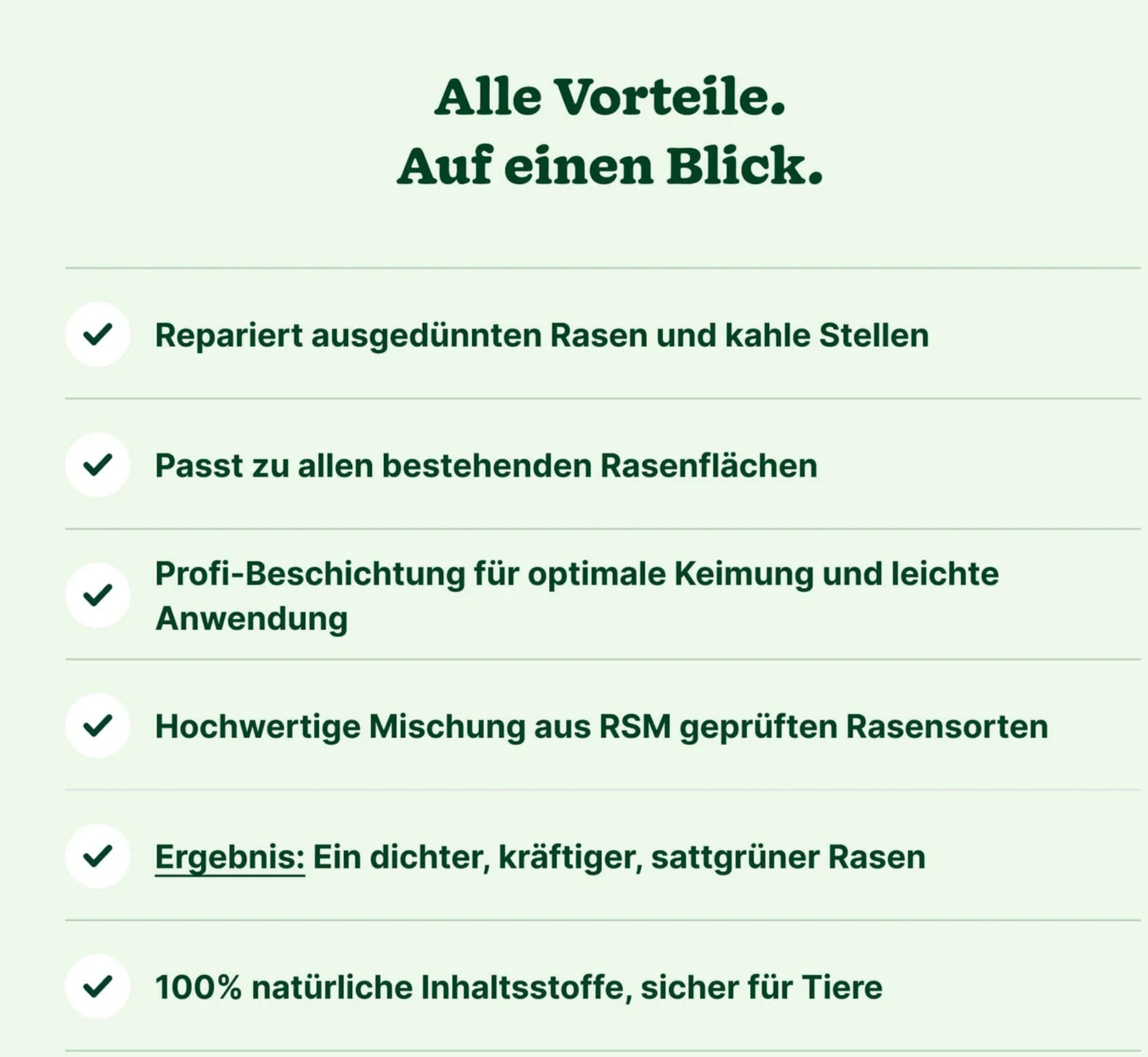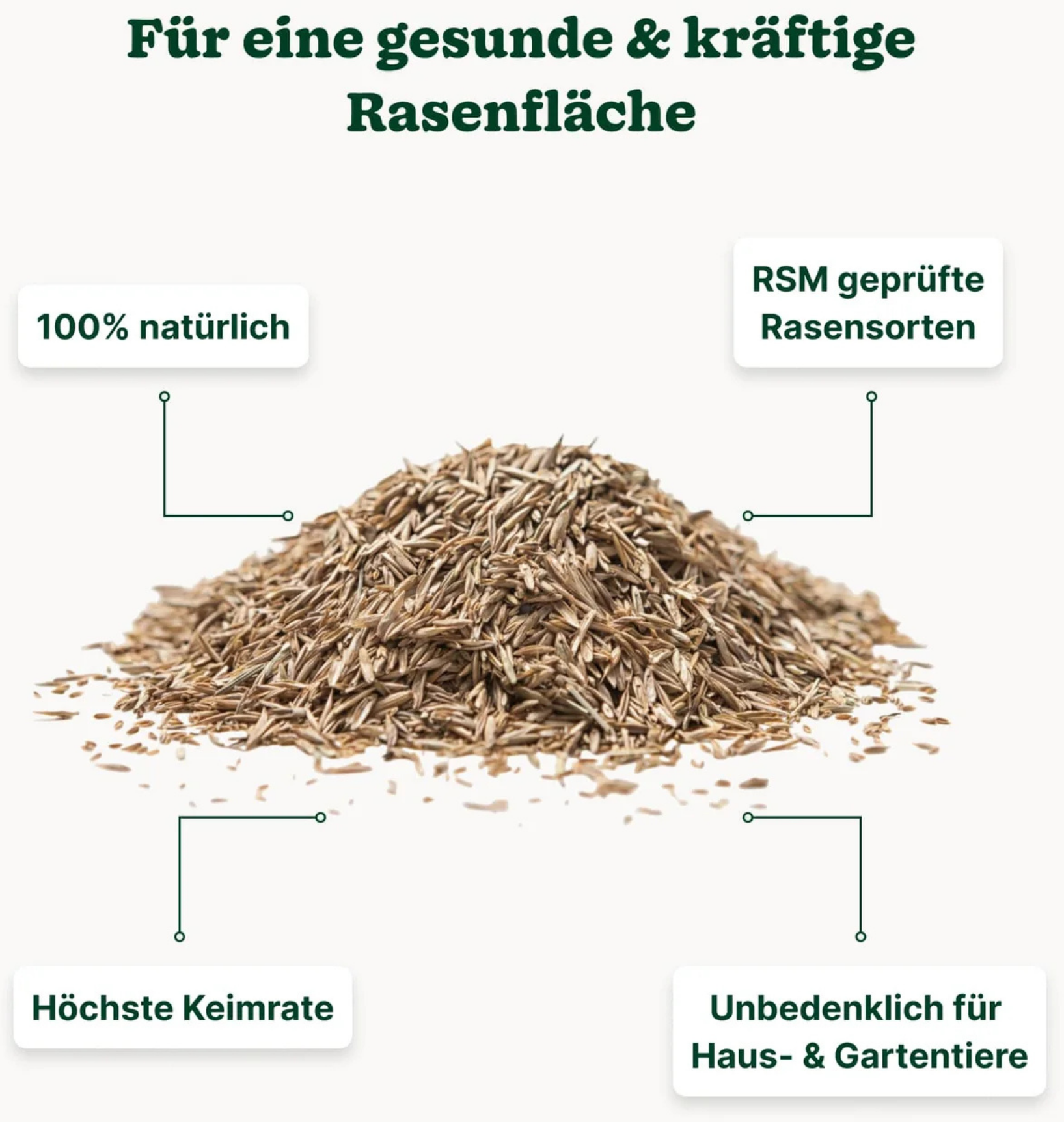 Wenn dein Rasen ausgedünnt oder fleckig ist, sorgt die Nachsaat dafür, dass neue Gräser schnell wachsen und die Fläche wieder lebendig und grün aussieht. So entsteht ein gleichmäßiger, widerstandsfähiger Rasen, der dich wieder richtig stolz macht.
