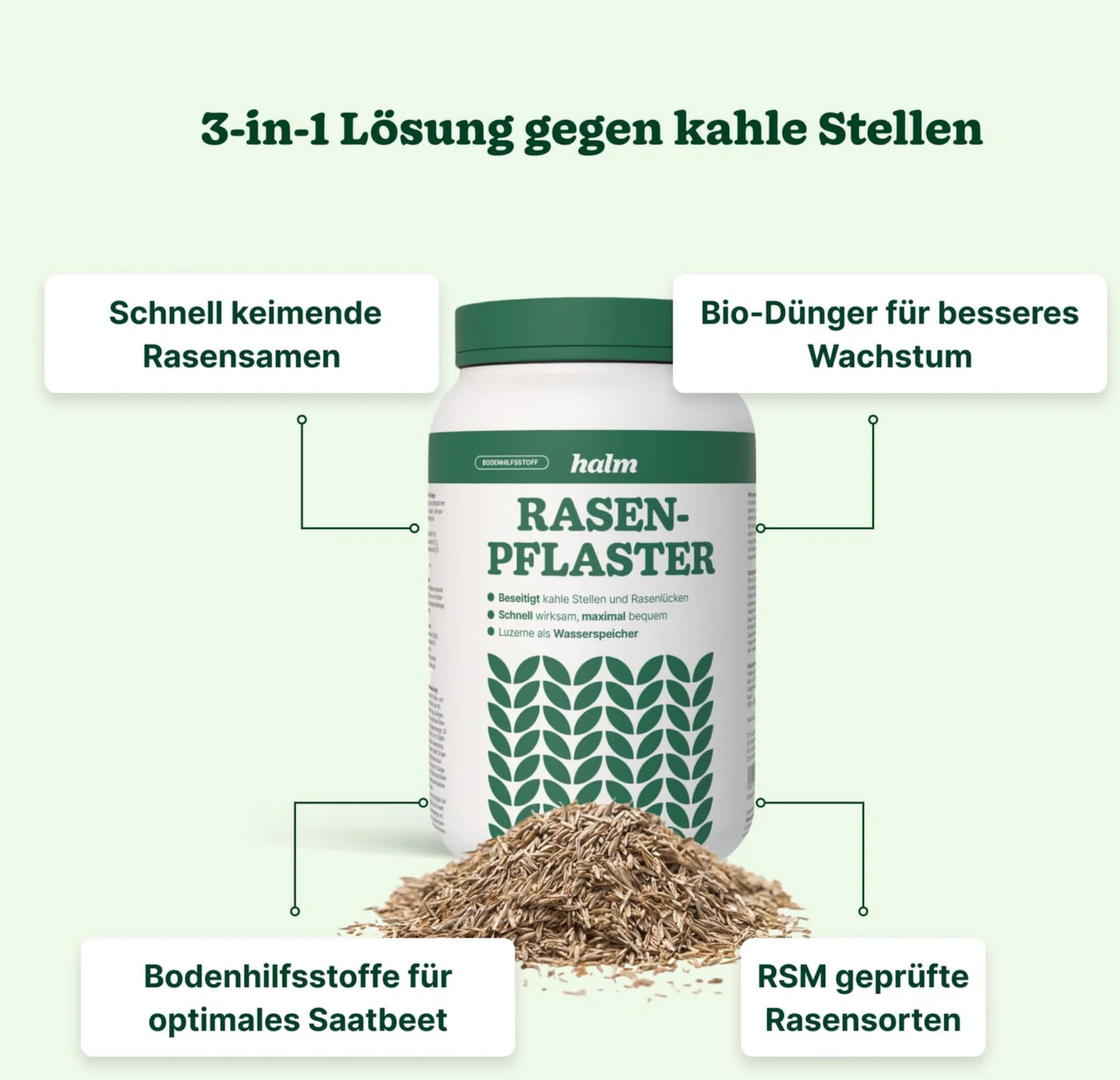 Kahle Stellen oder dünne Flächen müssen nicht länger ein Ärgernis sein. Mit dem Halm Rasenpflaster bekommst du alles in einem: neue Grasflächen, Nährstoffe und Wasserreservoirs für eine optimale Keimung. So füllt sich dein Rasen punktuell, wächst dicht nach und sieht wieder gepflegt aus.