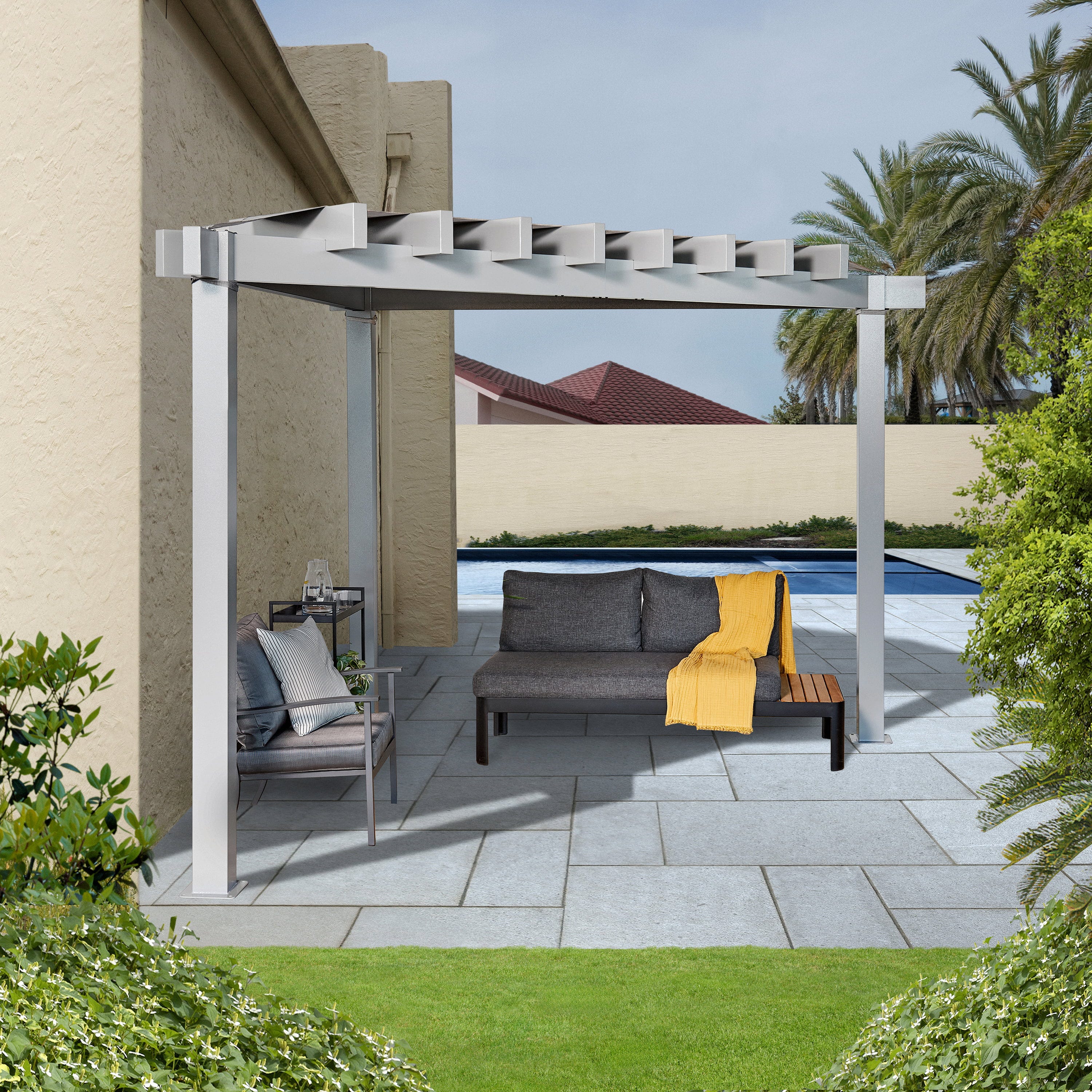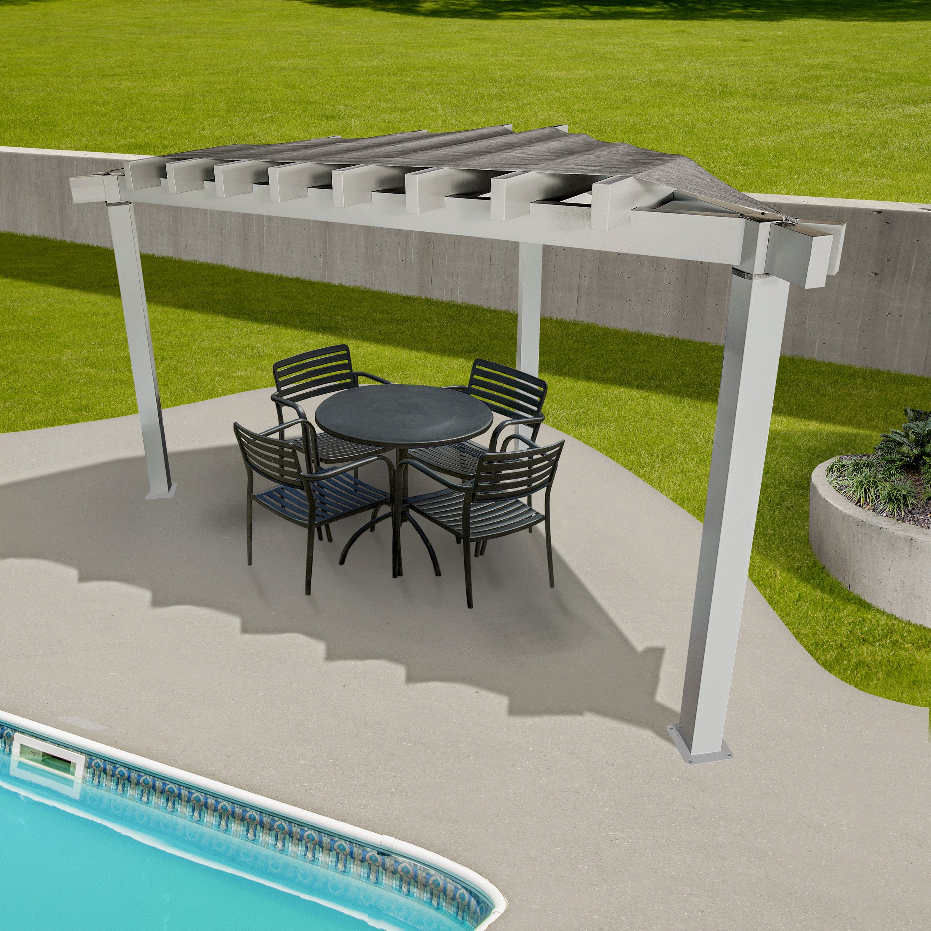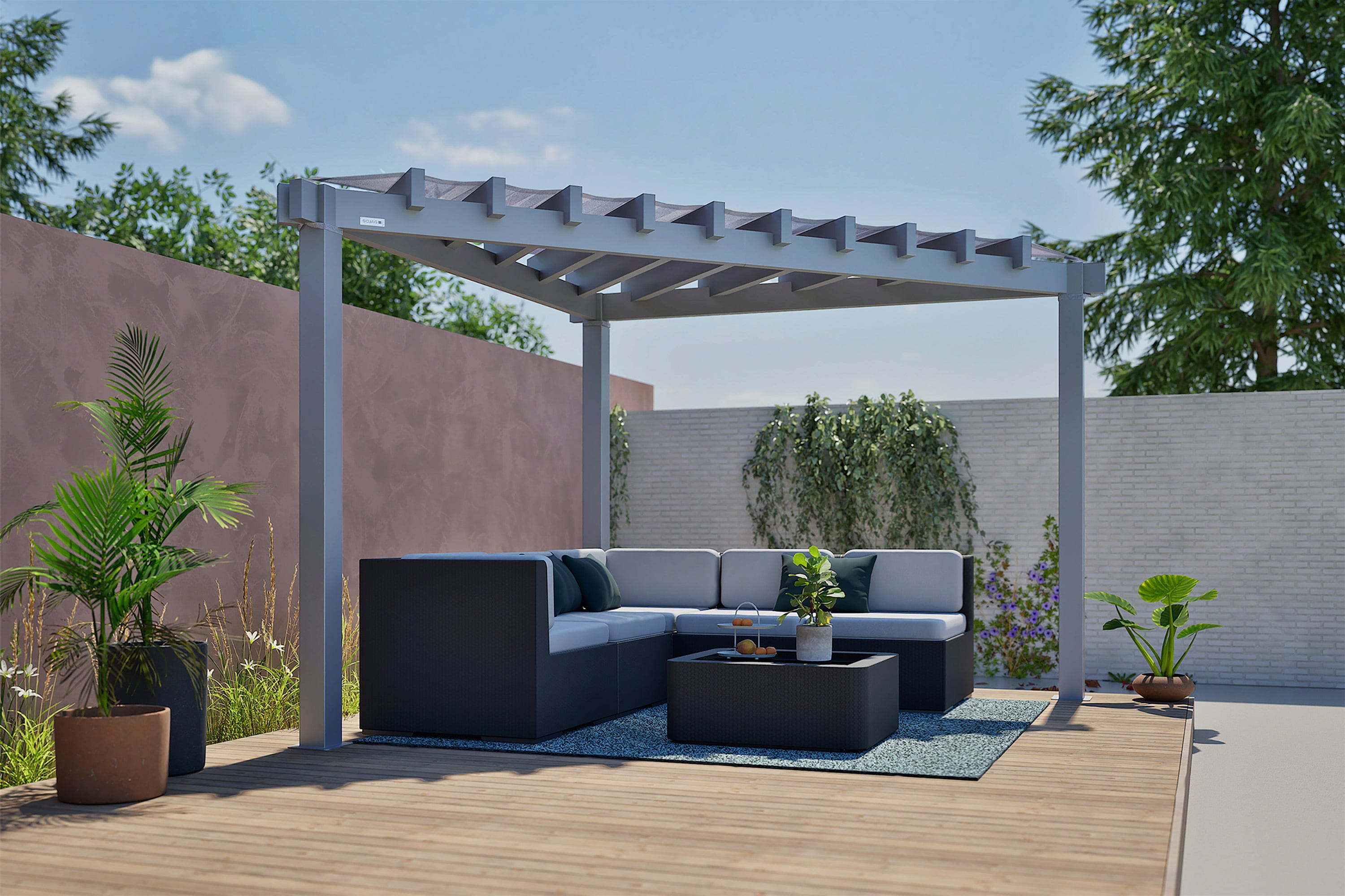 - Richte die Pergola so aus, dass das Sonnensegel die Nachmittagssonne abfängt, um den Sitzbereich optimal zu beschatten