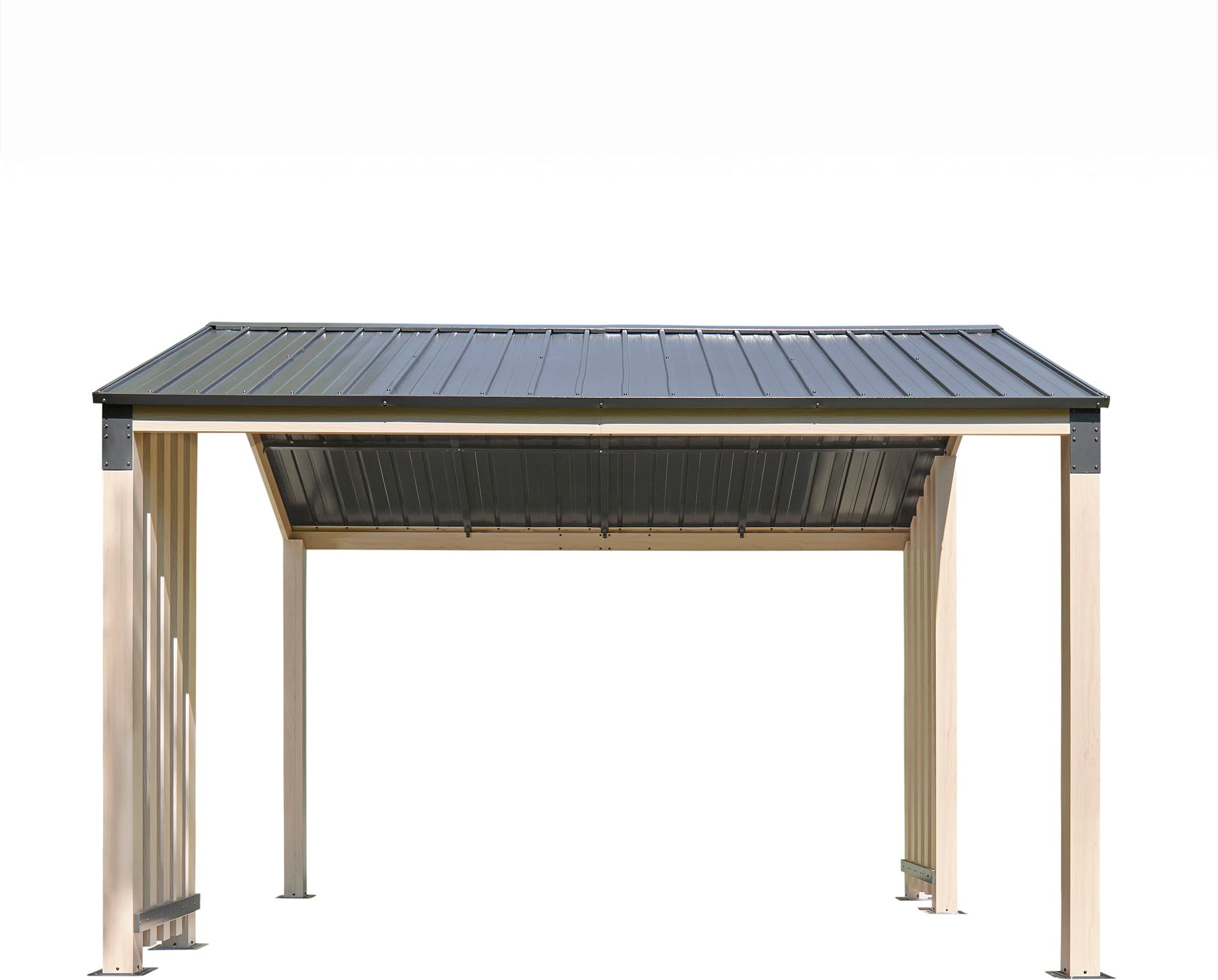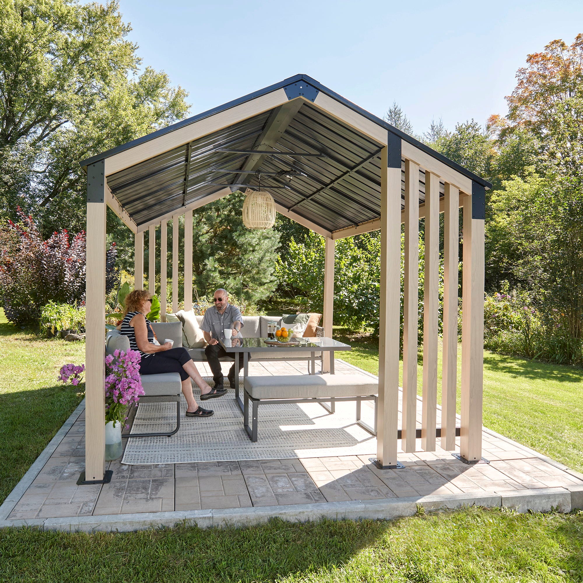 • Der Pavillon wird mit vorgebohrten Bodenplatten geliefert und kann einfach auf festem Untergrund verankert werden