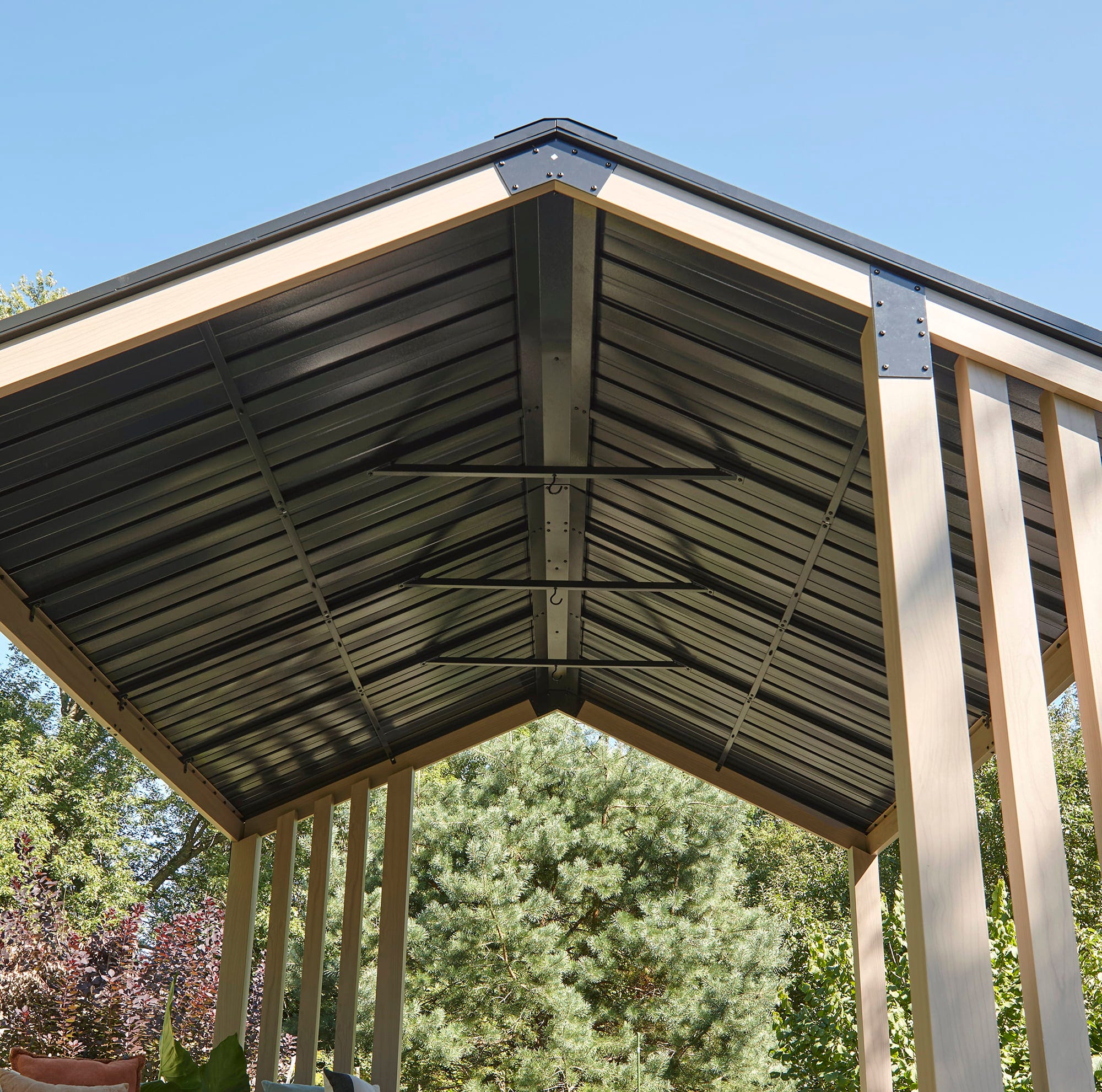 • 3 integrierte Deckenhaken ermöglichen das Anbringen von Lampen, Pflanzen oder Dekoration