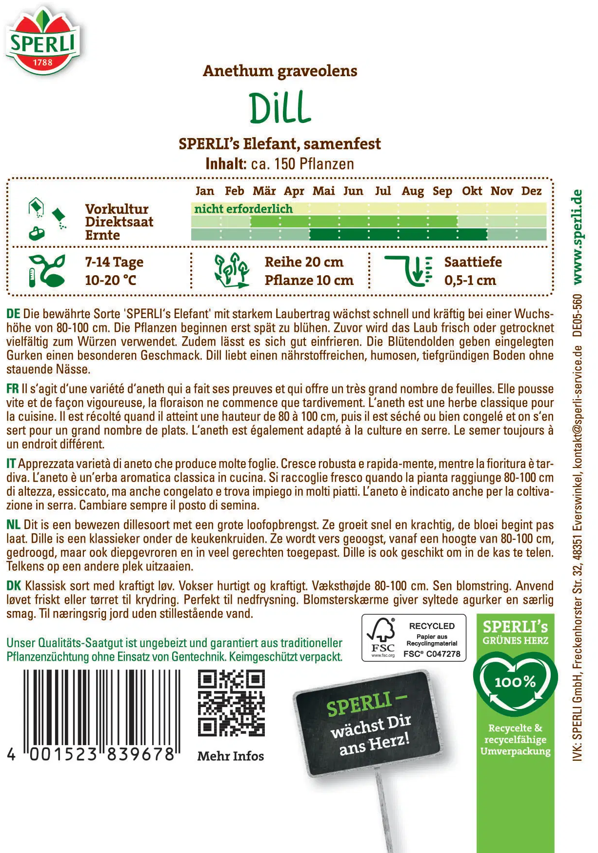 Der Dill ‚SPERLI’s Elefant‘ überzeugt mit kräftigem Wuchs, intensivem Aroma und besonders hohem Laubertrag. Da die Sorte erst spät blüht, kannst du über einen langen Zeitraum ernten – im Freiland von Juni bis September, im Gewächshaus sogar bis Dezember. Der Dill liebt sonnige bis halbschattige Standorte und gedeiht am besten in lockerem, durchlässigem Boden. Ideal zum Verfeinern von Fischgerichten, Salaten und Soßen oder zum Einlegen von Gurken.