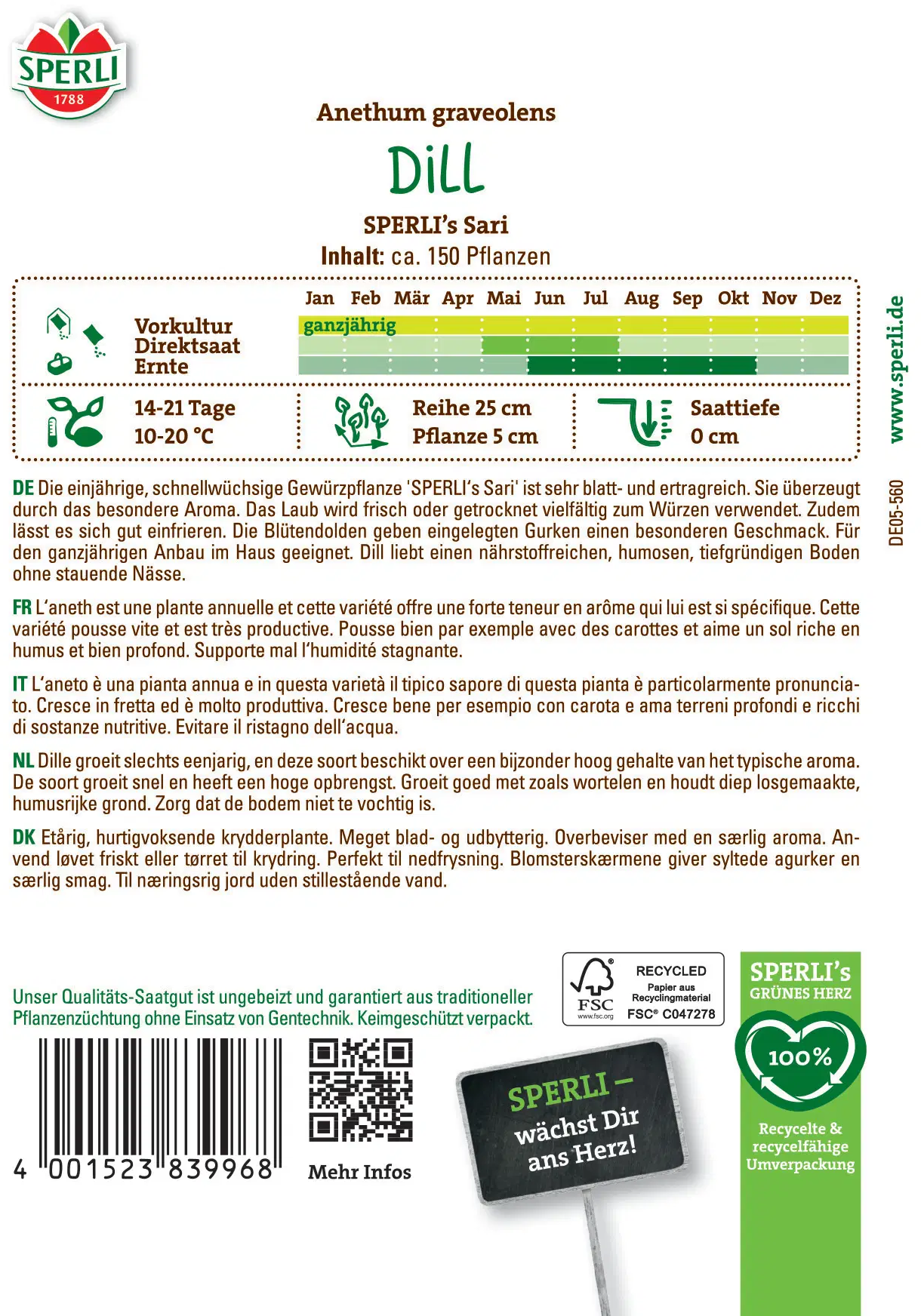 Der einjährige Dill SPERLI's Sari ist eine Spitzenzüchtung für deinen Kräutergarten. Mit seinen zarten, gefiederten Blättern wächst er schnell, ist sehr blattreich und sorgt für eine ertragreiche Ernte.