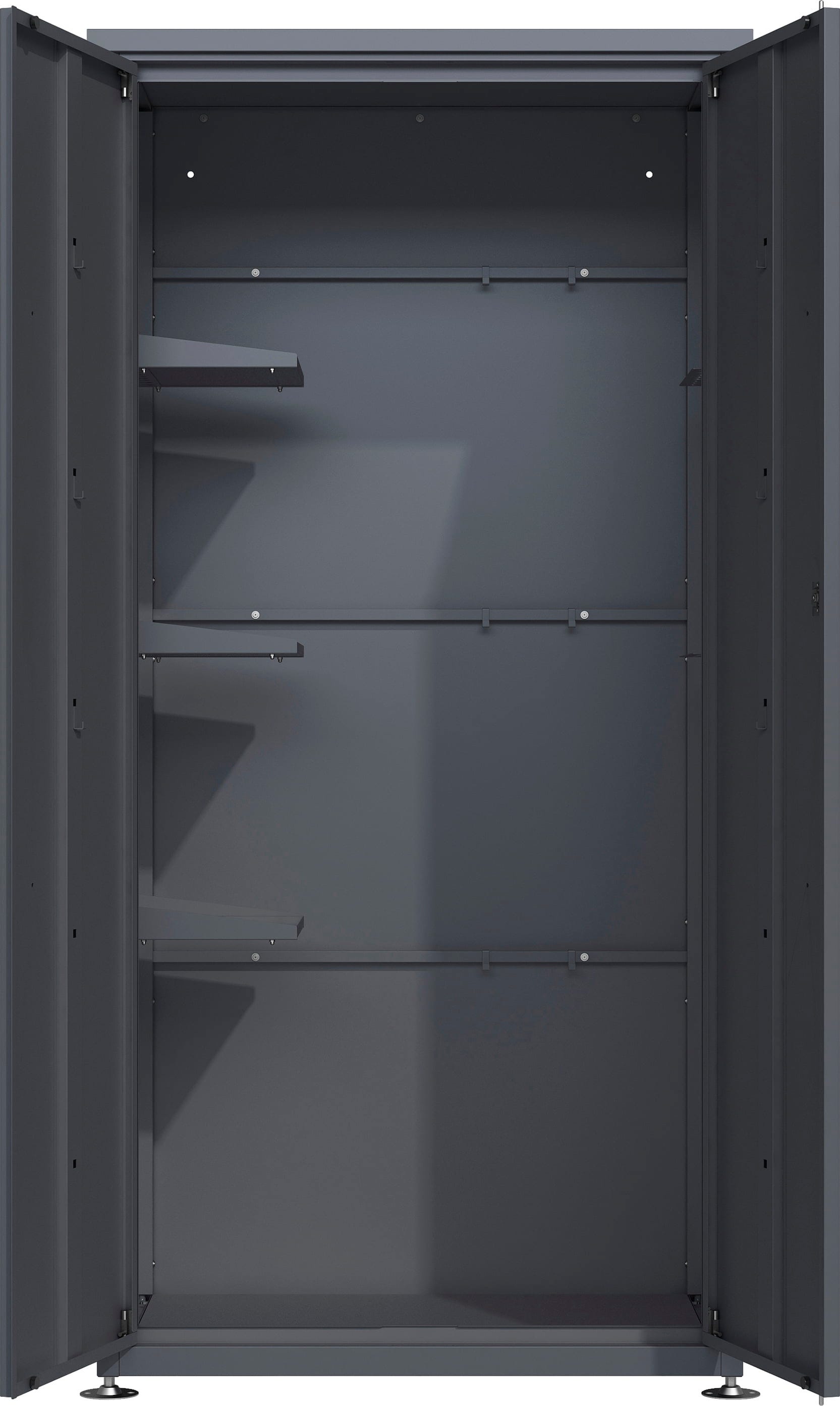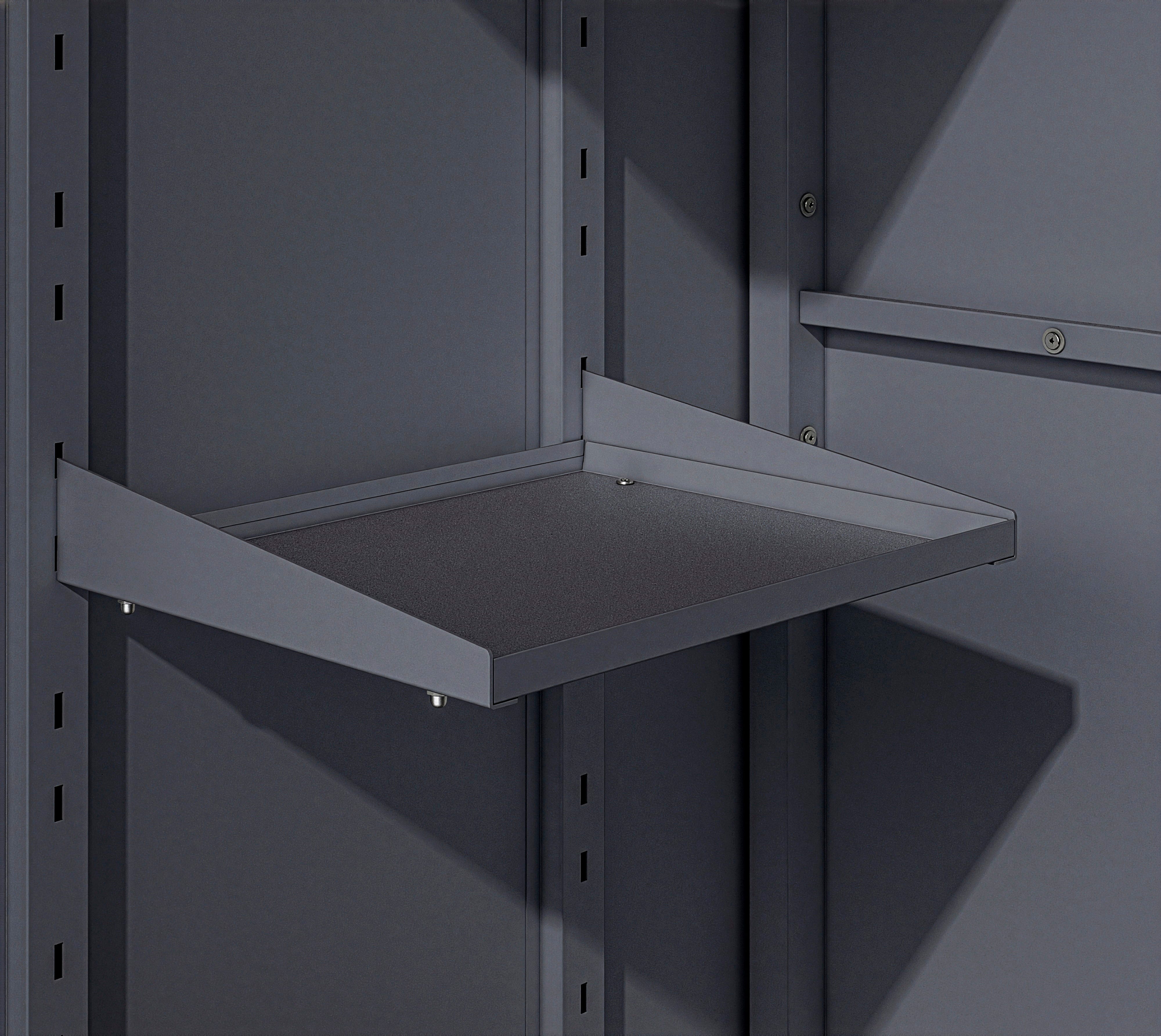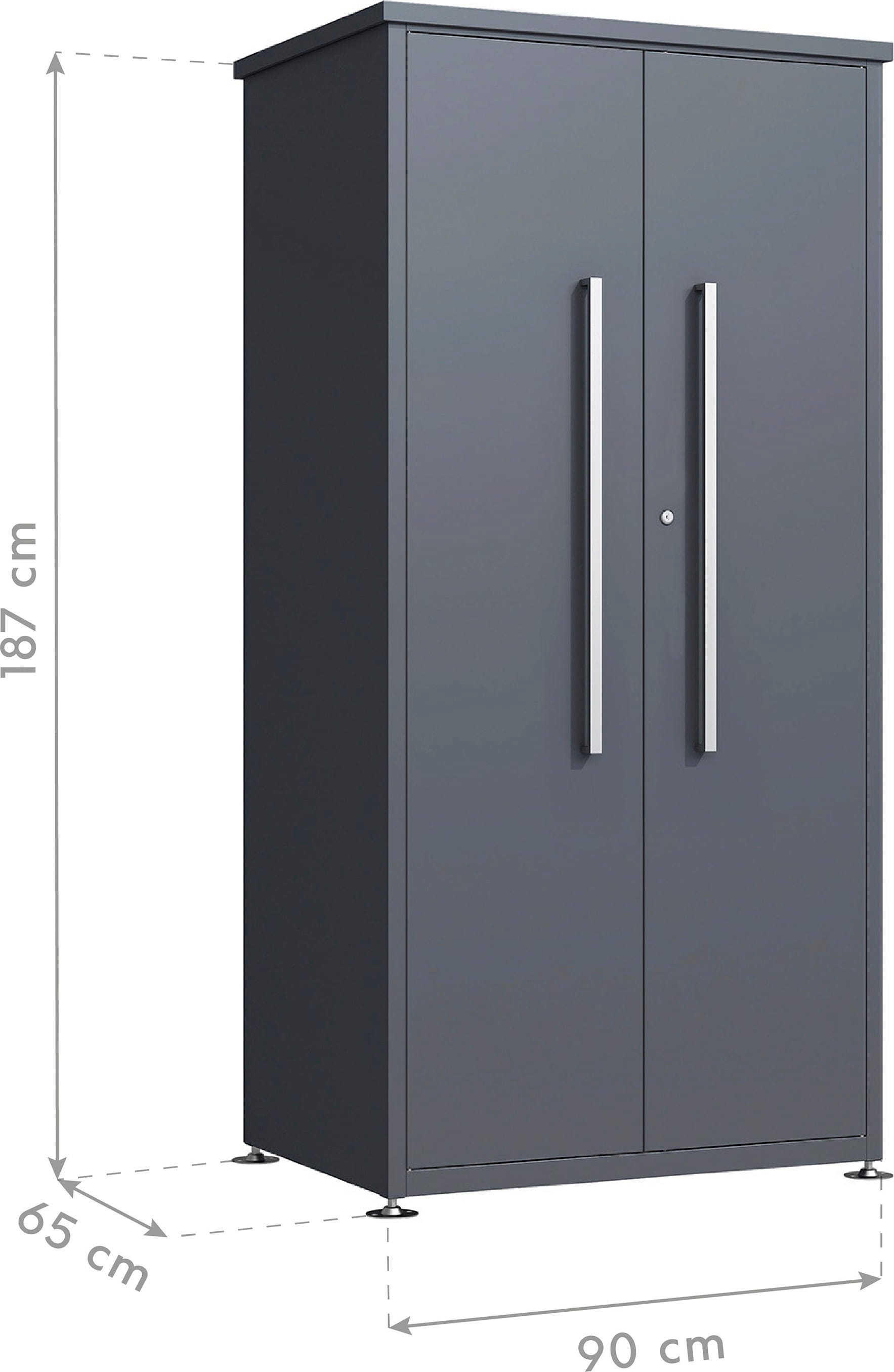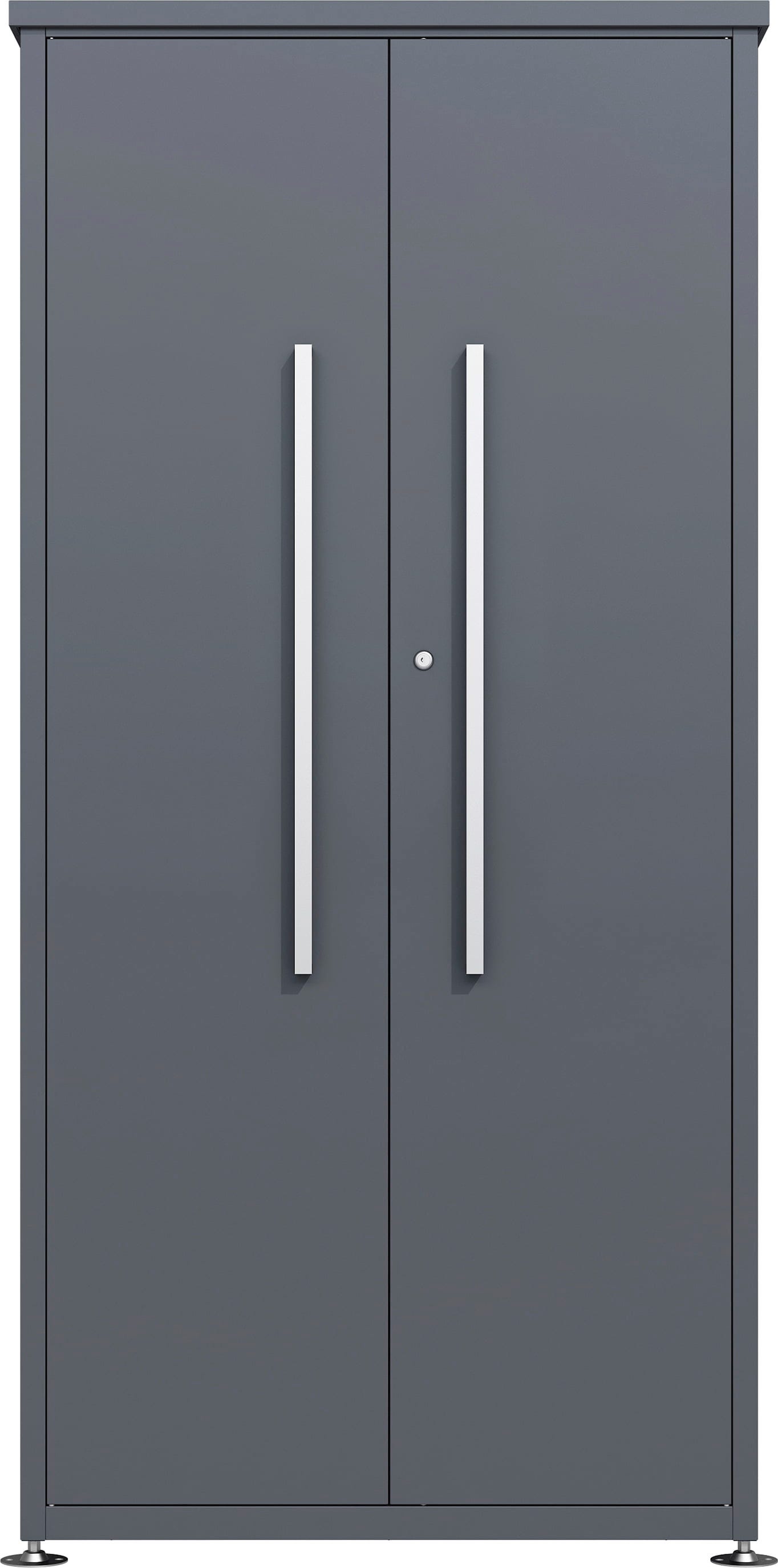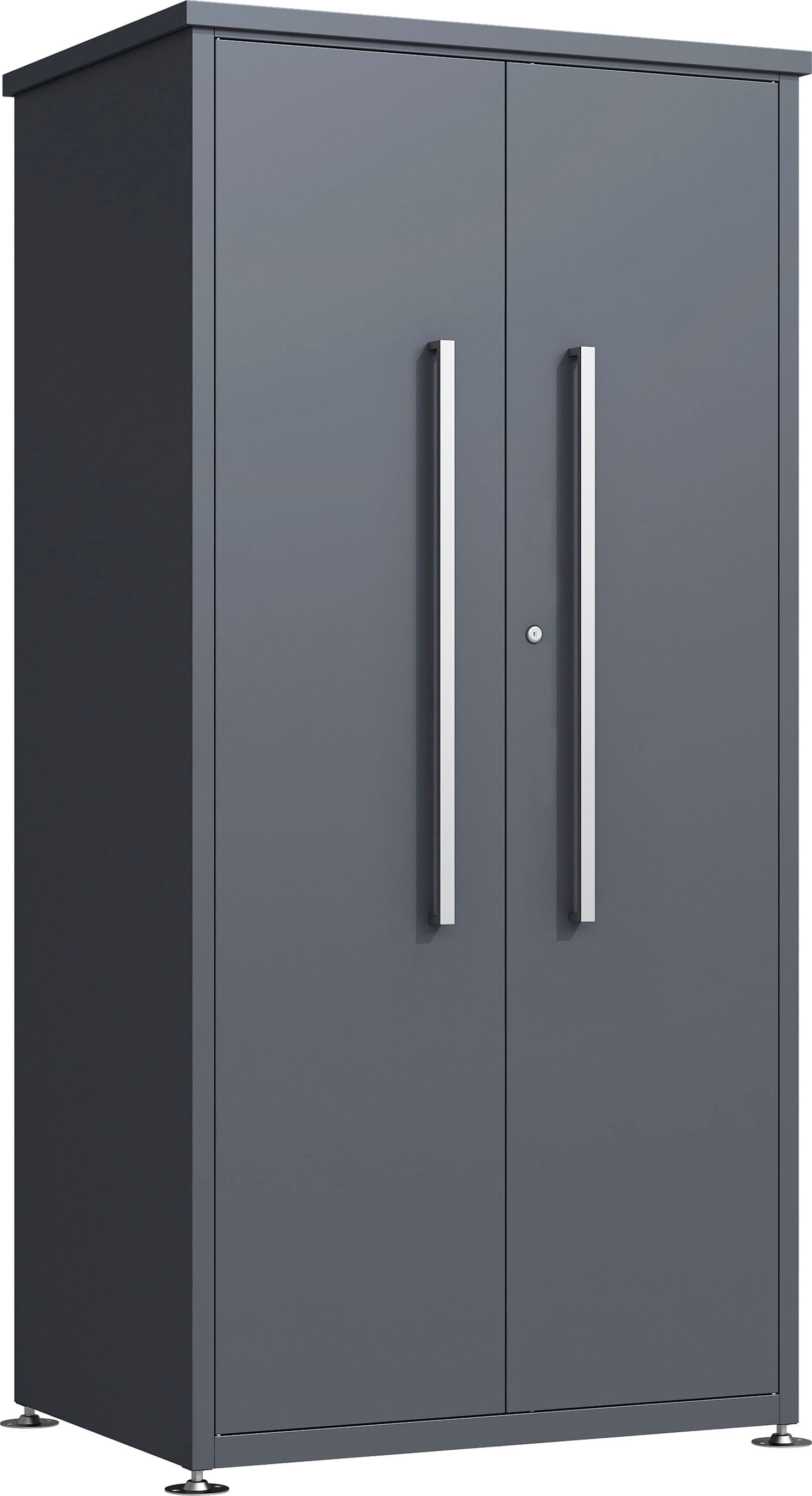 Gartenschrank Capsa vereint modernes Design mit maximalem Stauraum. Er ist ein wahrhaftes Raumwunder aus pulverbeschichtetem Stahl, das Ordnung in die Gartengeräte bringt und dank seiner Witterungsbeständigkeit perfekt für den Außeneinsatz geeignet ist. Die breiten, versperrbaren Doppelflügeltüren sind weit zu öffnen und erleichtern das Einlagern von sperrigen Werkzeugen und anderen Gartenhelfern.